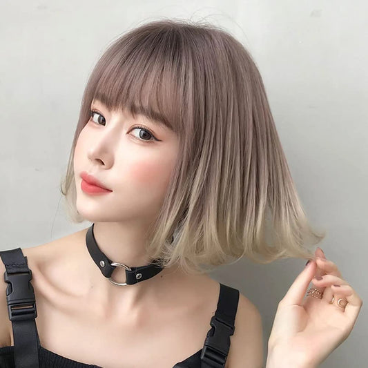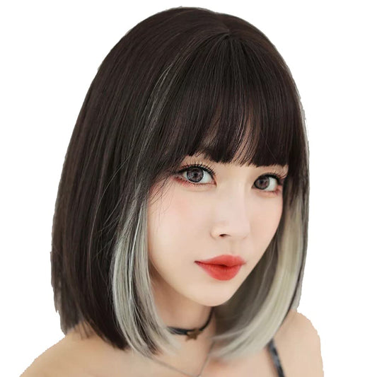 AIKO PRO Korean Fashion 12 Inch Gradient Color Short Bob Wig for Women with Bangs, Natural Synthetic Short Lolita Cosplay Wigs For Cosplay and Daily Wear, Ombre