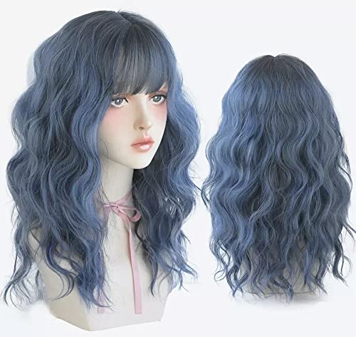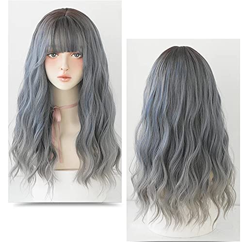 AIKO PRO Chic Korean Fashion 23 Inch Long Curly Wavy Wig Bangs, Natural Heat-Resistant Synthetic Hair Wigs with Fringe For Cosplay and Daily Wear (Gray Blue)