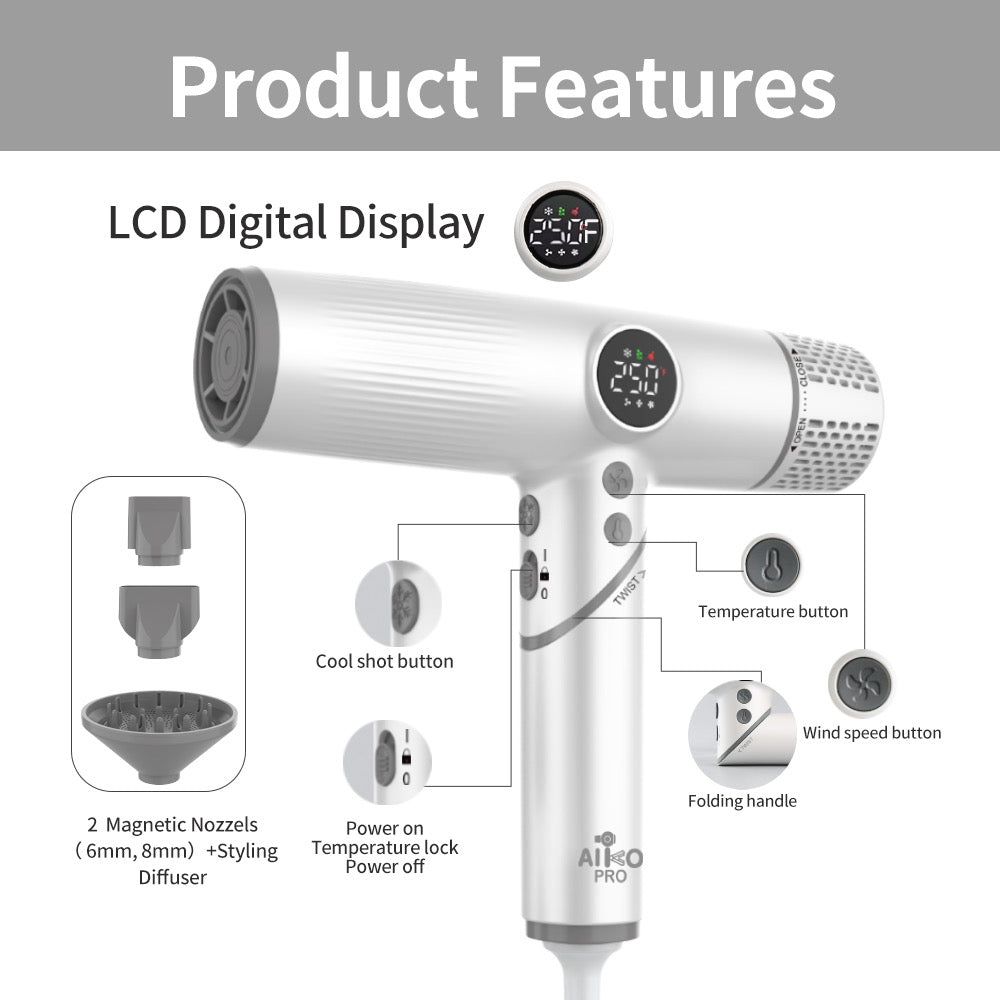 1800W High-Speed Foldable Travel Salon Ionic Blow Dryer, Brushless Motor for Fast Drying & Frizz Control, 3 Temps & 3 Speeds, Lightweight, Portable & Quiet with 3 Magnetic Nozzles