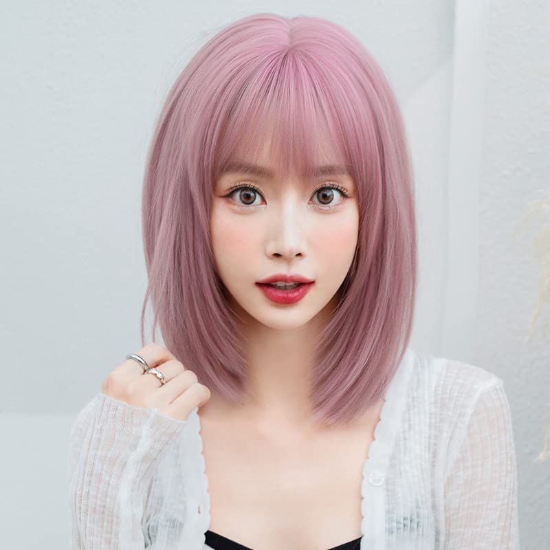 AIKO PRO Korean Fashion 14 Inch Straight Short Bob Wig for Women, Natural Shoulder-Length Straight Synthetic Short Lolita Cosplay Wigs with Bangs For Cosplay and Daily Wear, D-133, Pink