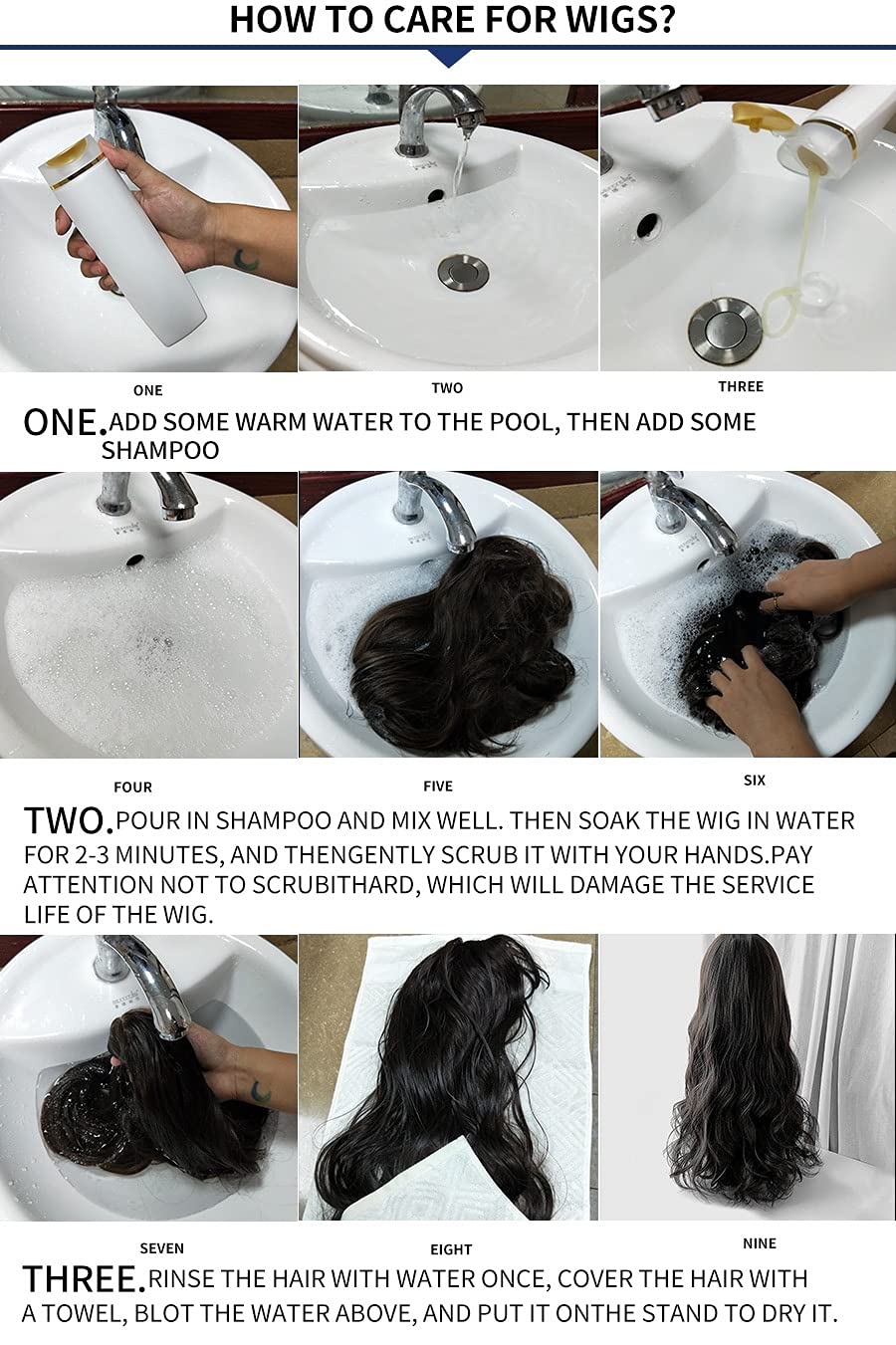 1. The wig doesn't need to be washed frequently but cares and maintain it regularly 2. Smooth and tidy wig before putting them into water 3. Wash and care using a little mild shampoo in cold water 4. Clean cold water to rinse it again and towel to blot up the water 5. And then hang and dry it naturally